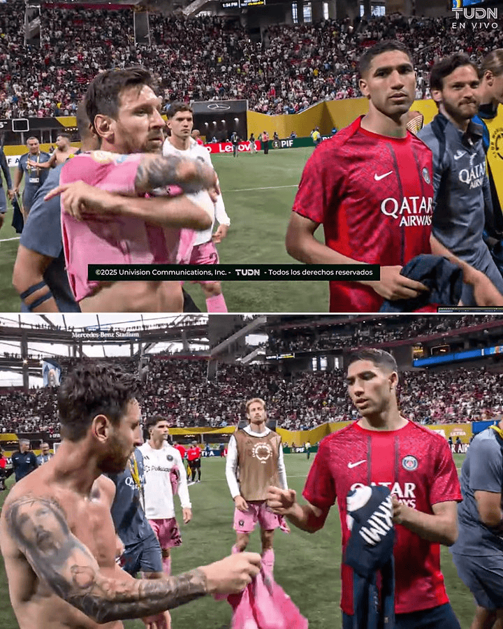 当终场哨响后,梅西失意离场。巴黎场上队长阿什拉夫主动上前拍肩安慰,并且要求交换球衣。而梅西尽管心情低落,还是脱下球衣满足了阿什拉夫的请求,两人还拥抱致意。尽管阿什拉夫是公认的姆巴佩闺蜜,但实际上他与梅西关系也很不错,尤其是在梅西效力巴黎后期,阿什拉夫甚至还为梅西出头吃过红牌。